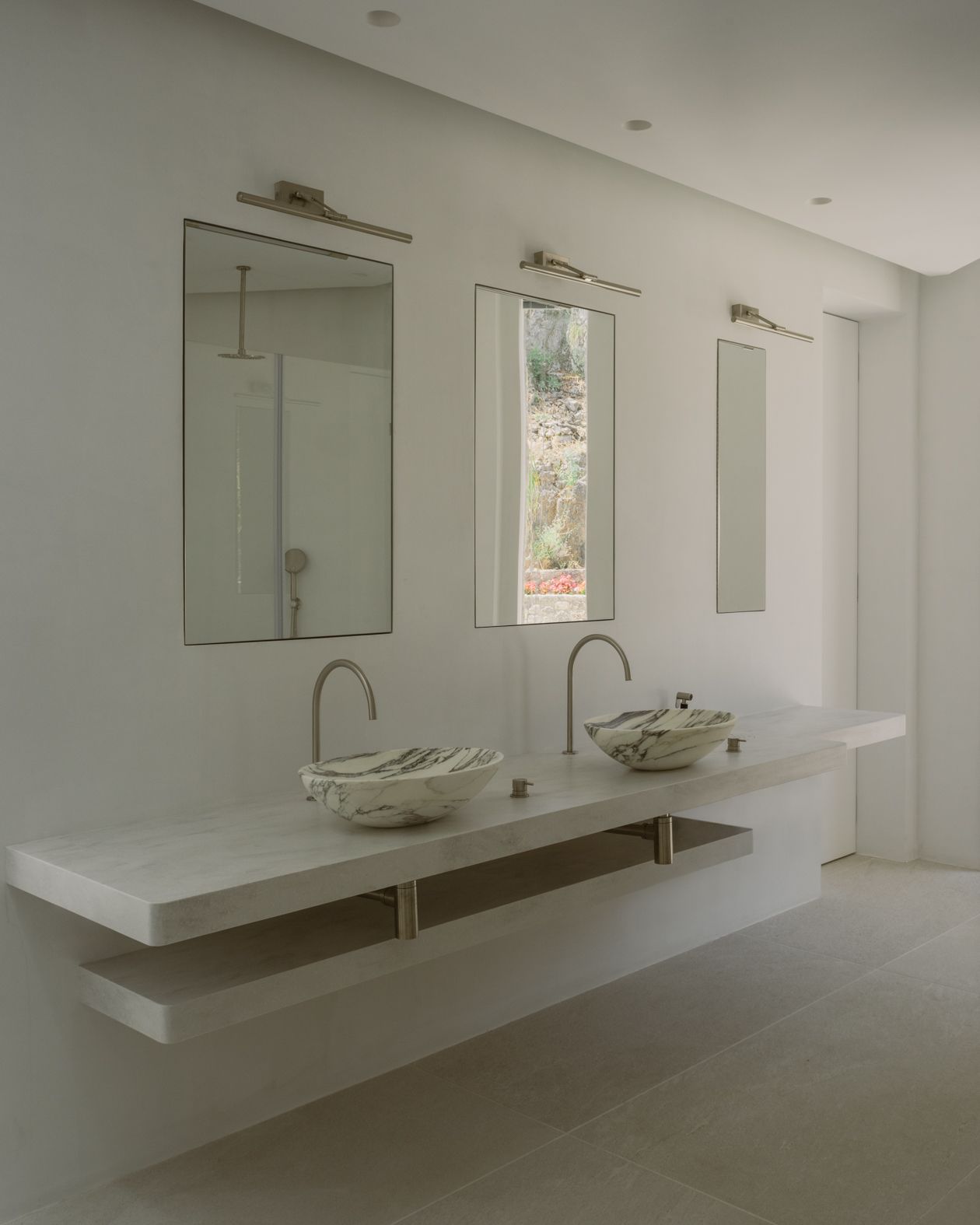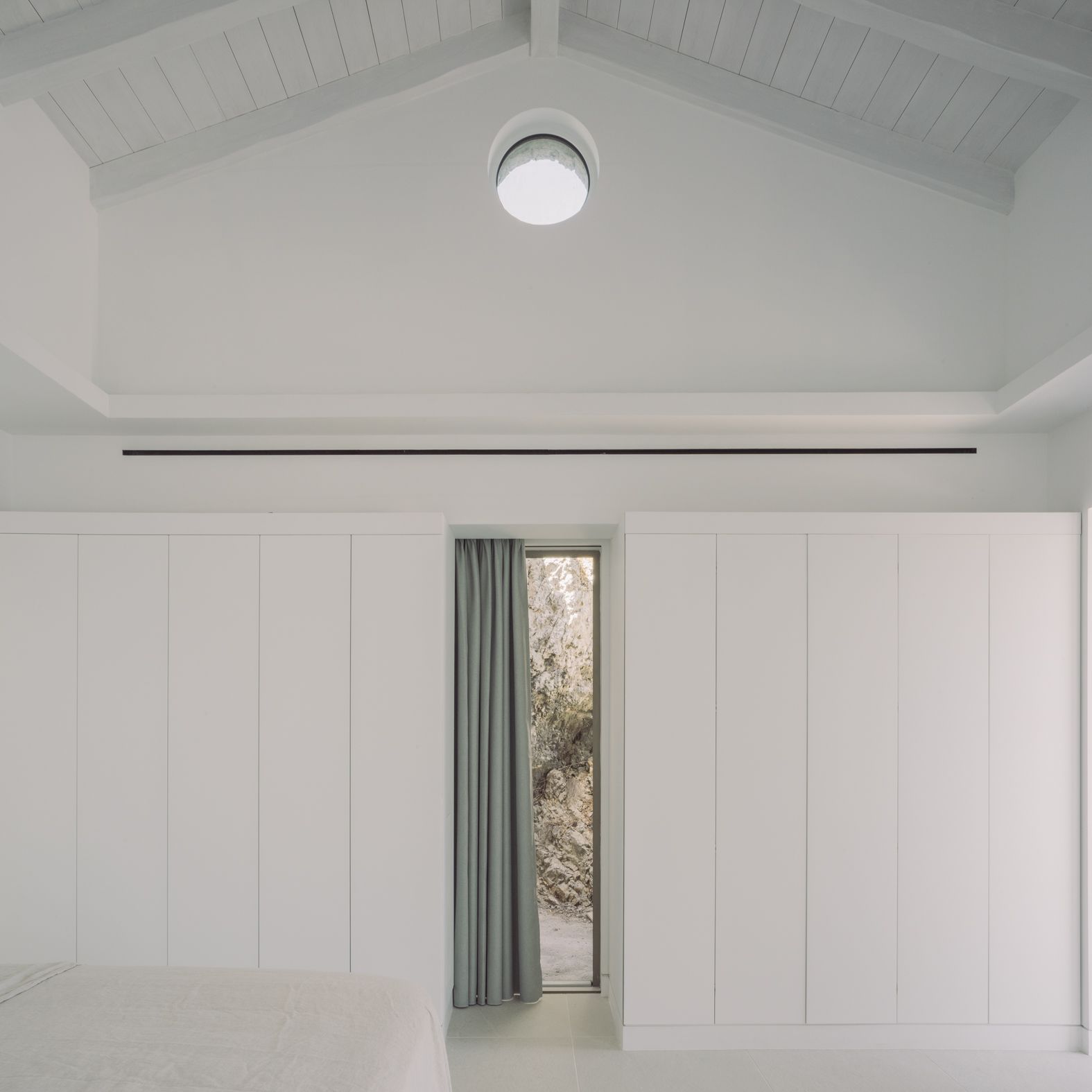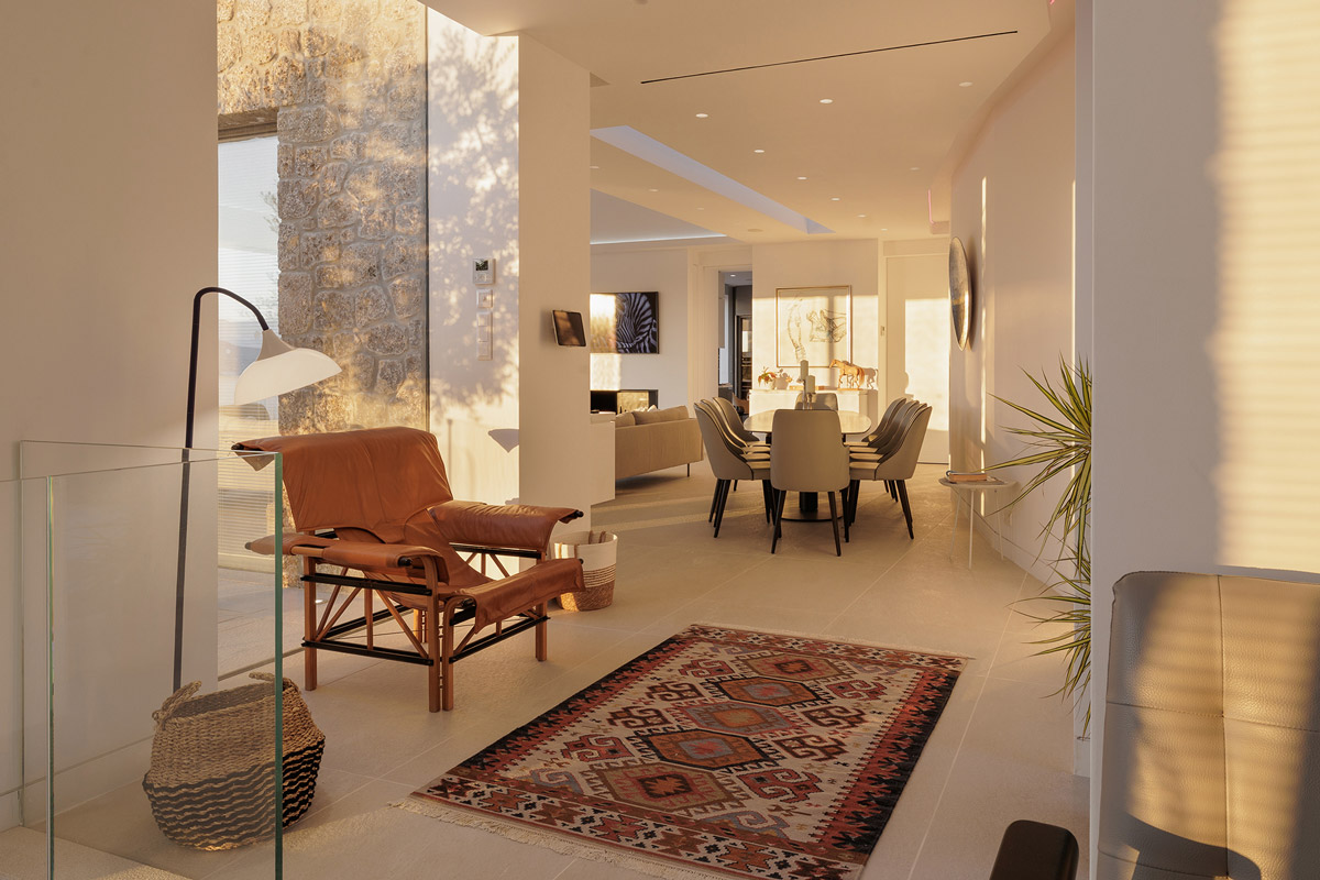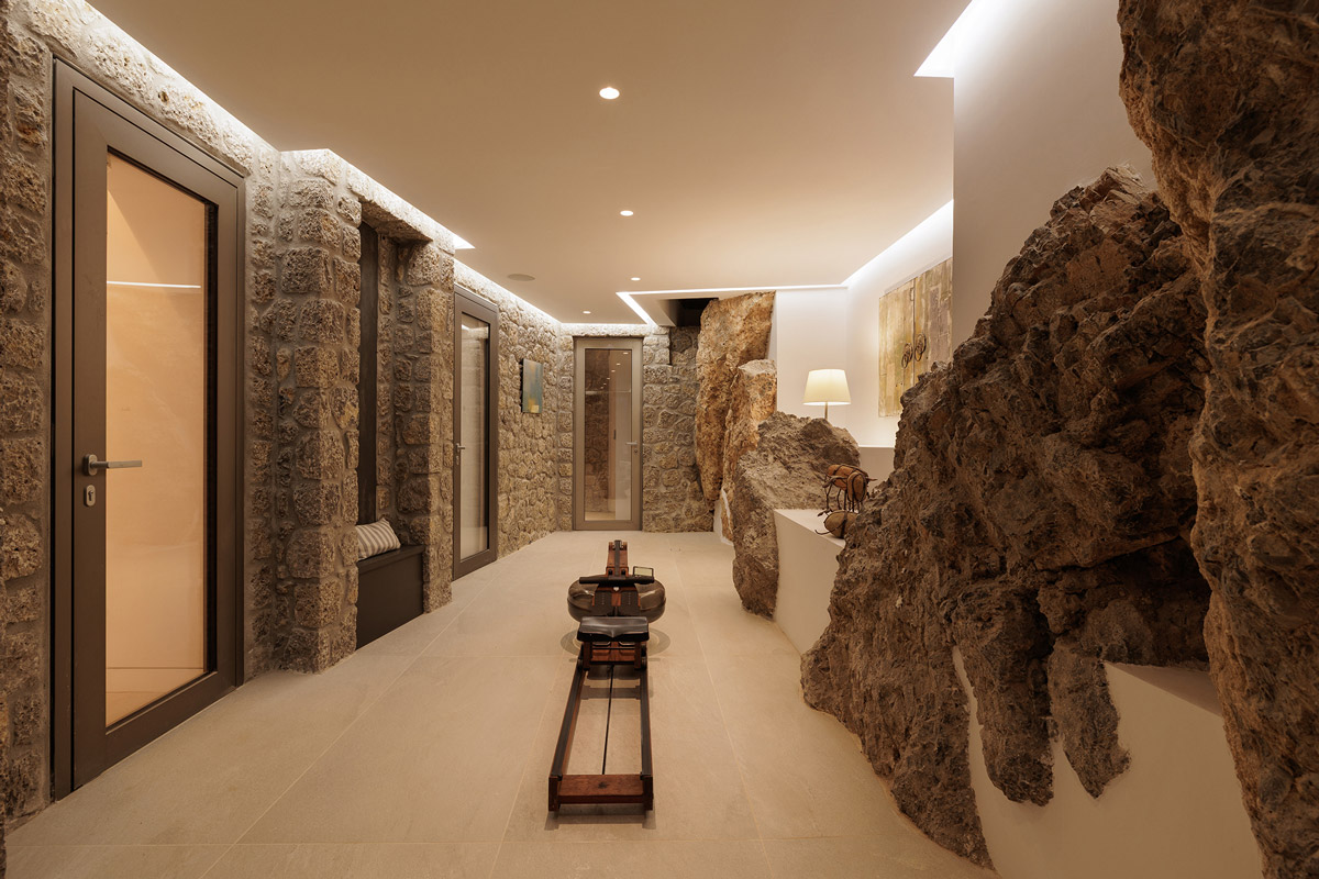 The architecture team worked on embedding the home into its land – taking into account the plot’s rocky outcrops, which have been incorporated in the design, and preserving a mature olive tree found on site. The plant now serves as an important ‘anchor’ to the ancient grounds around the villa.