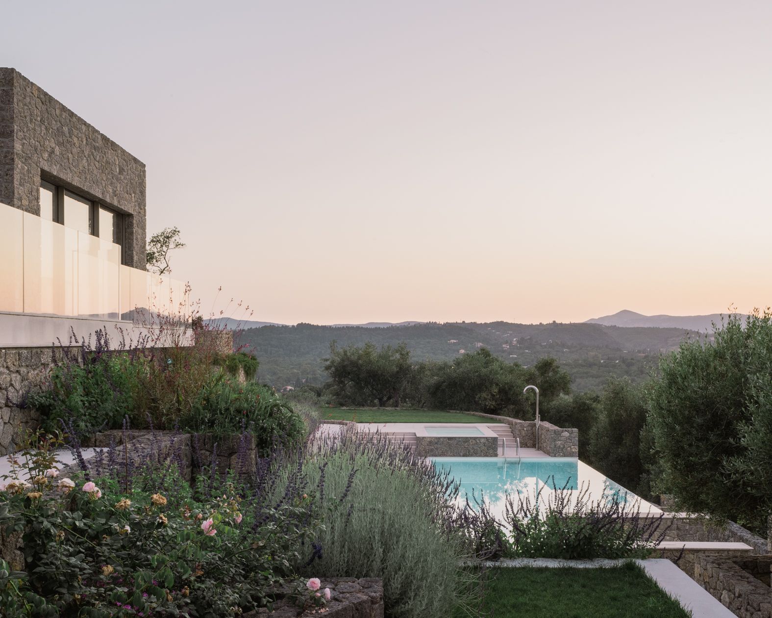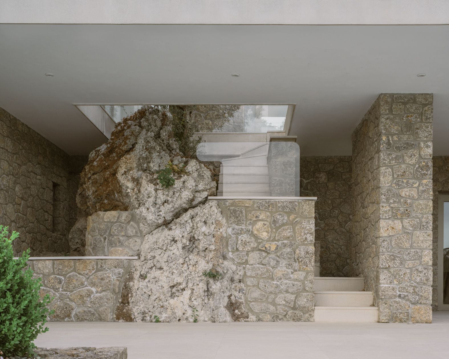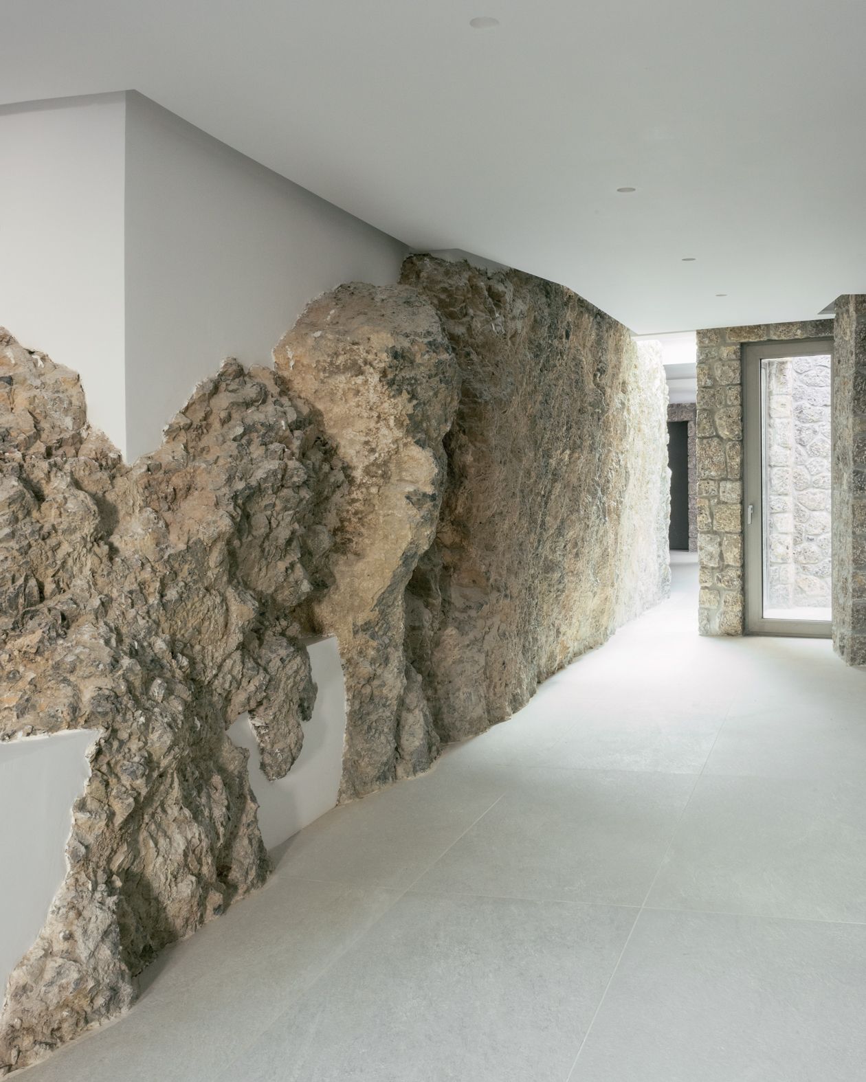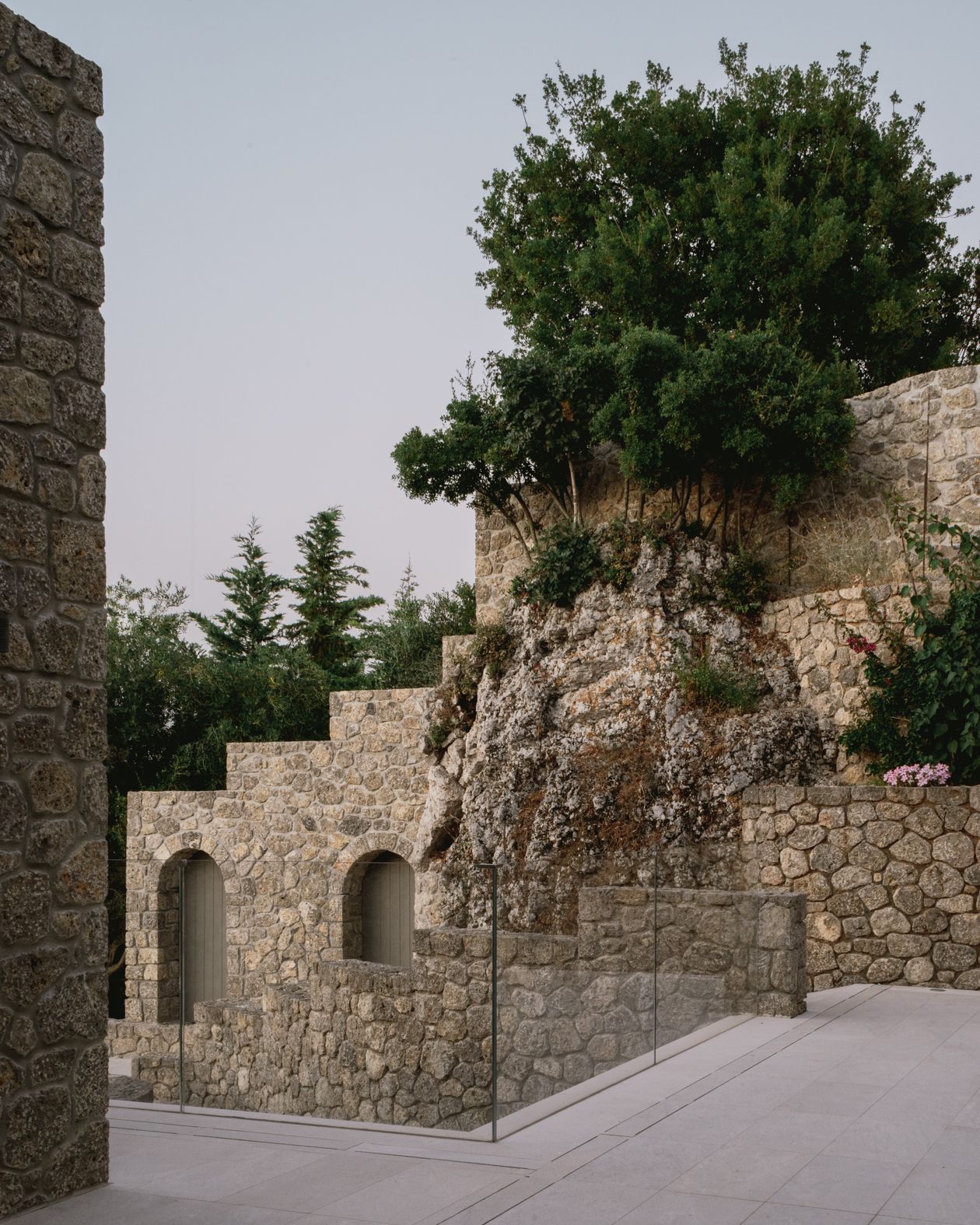 The main body of the home is made out of hand-shaped, locally sourced stone, which has been crafted by local specialist technicians and craftspeople. It frames swathes of glazing which ensure the views – available from every bedroom and main room in the house – become a protagonist throughout.